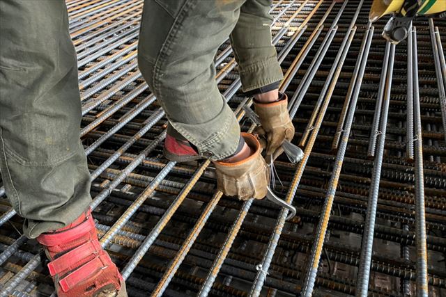 ハッカーなどを使って「結束線」と呼ばれる針金で鉄筋をとめる作業を行います。